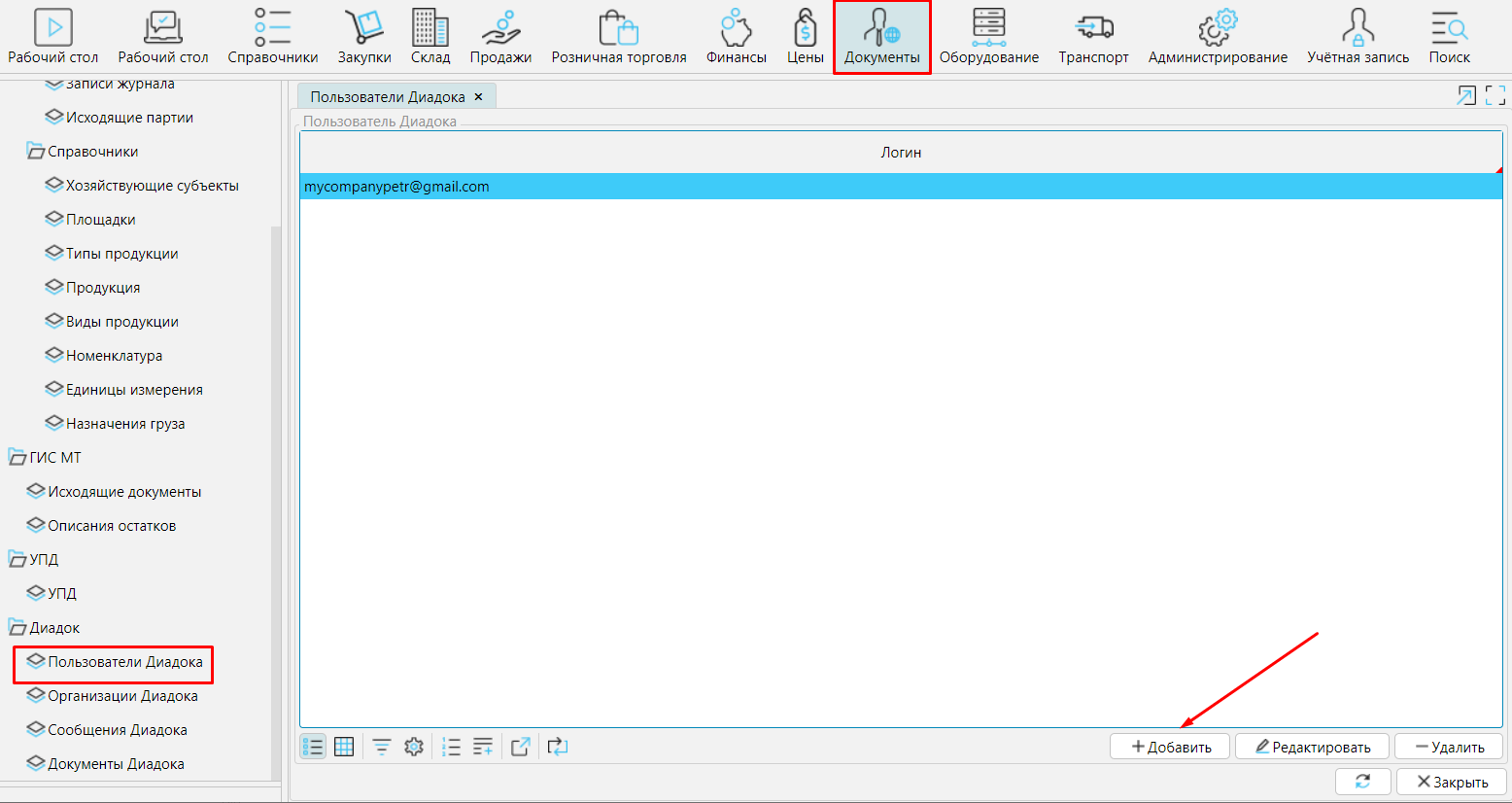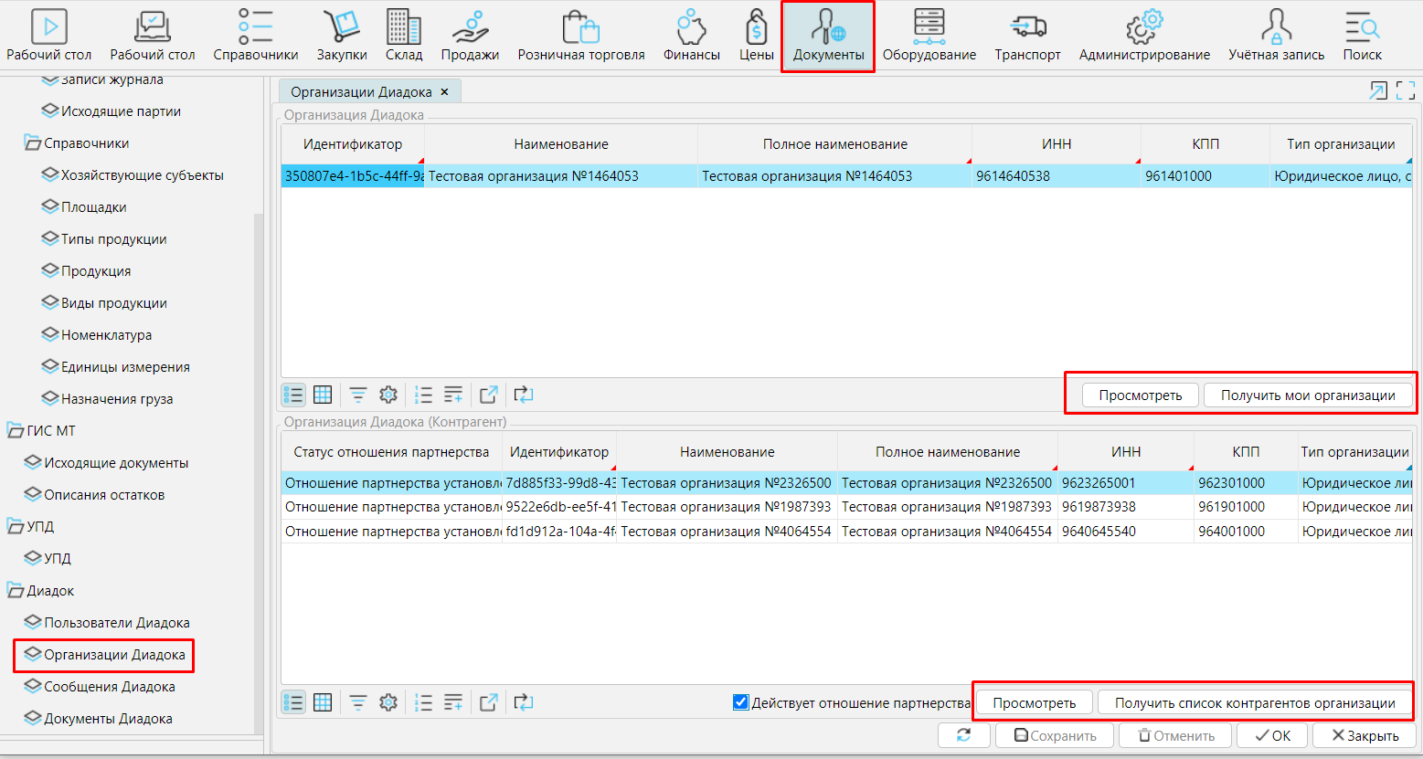 Собственная компания и контрагенты, участвующие в ЭДО отображаются на форме Документы - Организации Диадока.