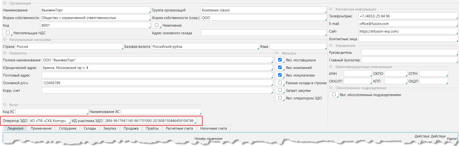 В карточке организации (компании) нужно указать организацию Оператор ЭДО и ИД участника