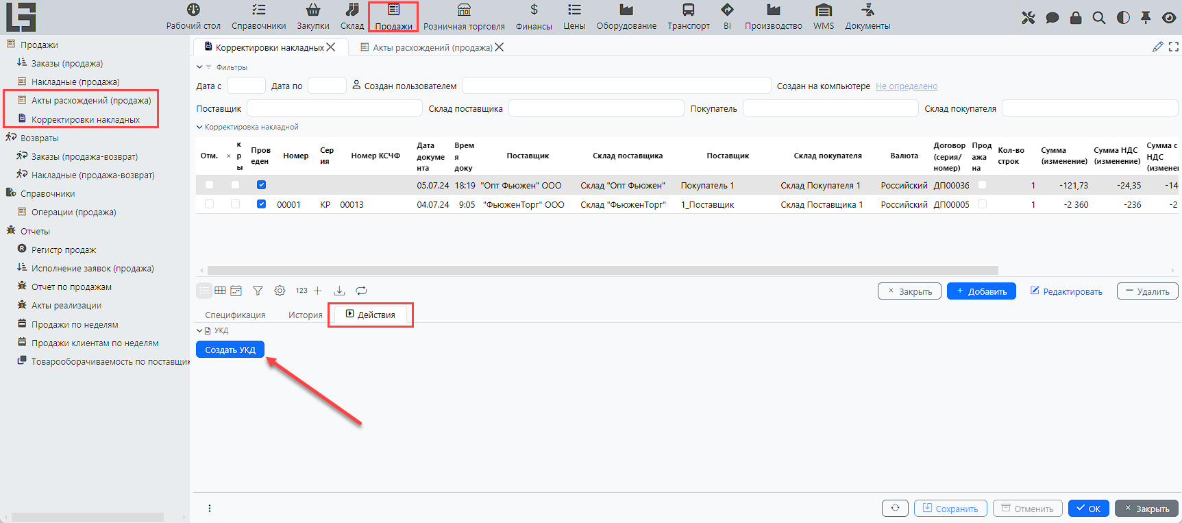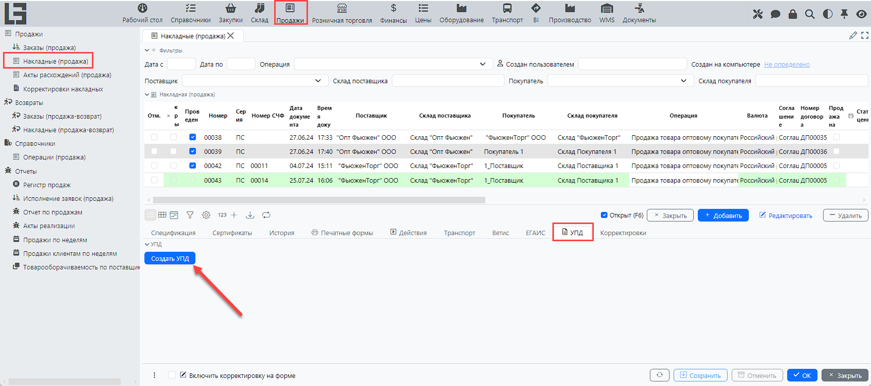 УПД формируется на базе расходной накладной. На форме Продажи - Накладные. Нужно выделить накладную, перейти на вкладку УПД и нажать Создать УПД (рис.1). Созданный документ будет отображаться на форме Документы - УПД , а на вкладке УПД будет указан номер созданного документа и появятся действия, позволяющие изменять созданный УПД (рис. 2).