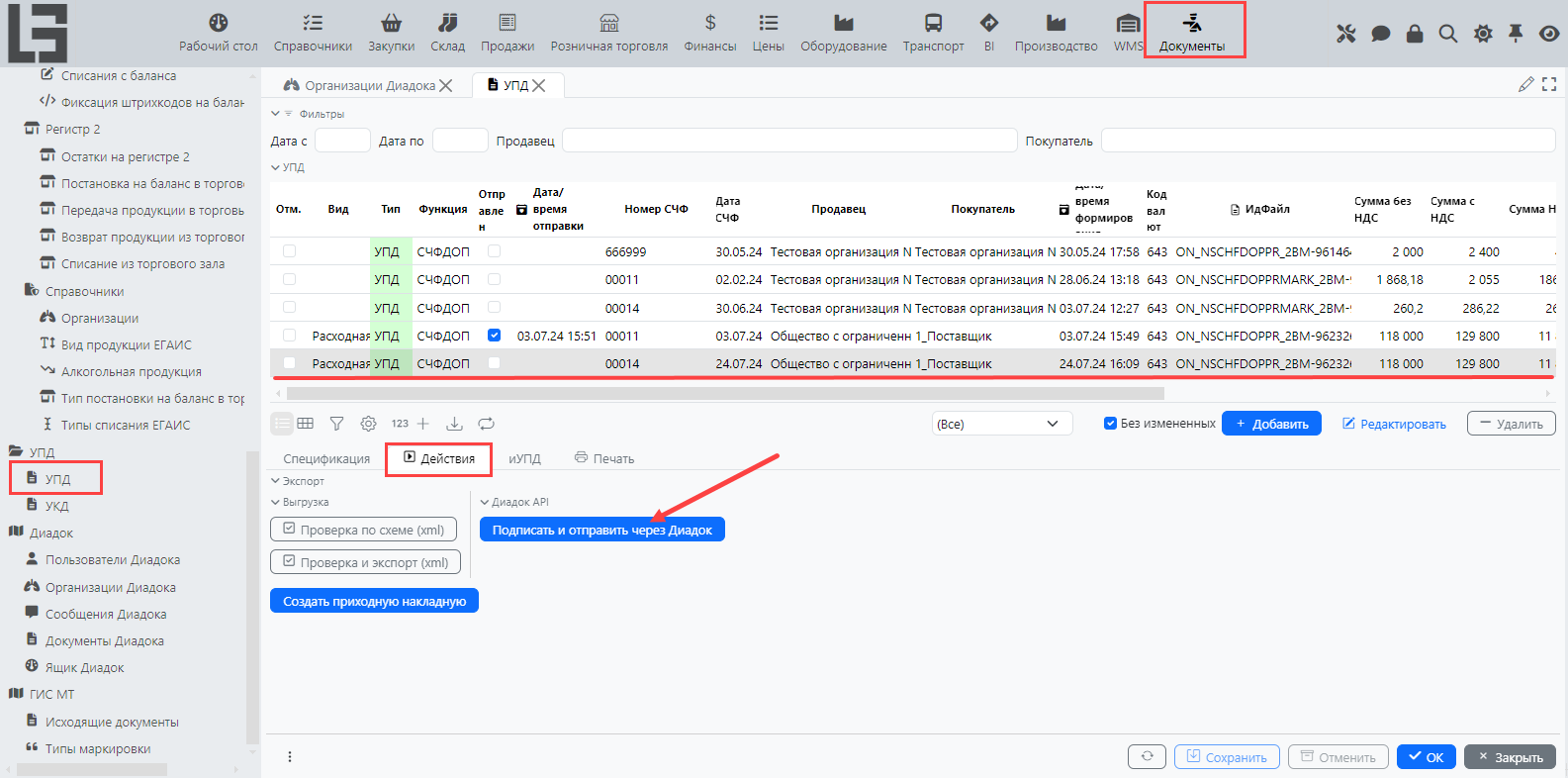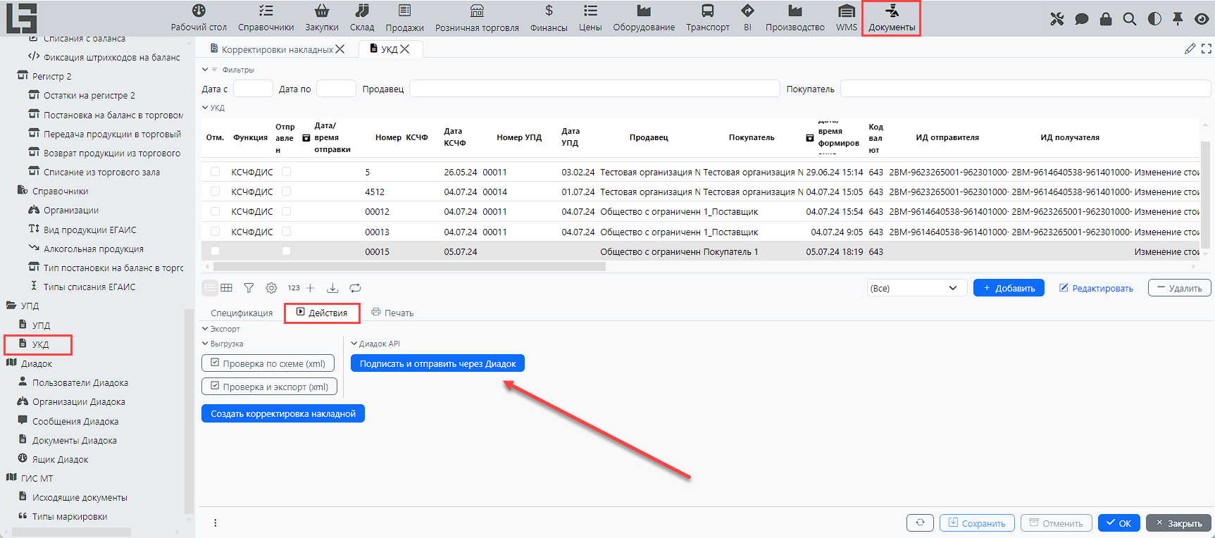 УПД можно отправить контрагенту через API Диадок как непосредственно из документа, так и из списка УПД.