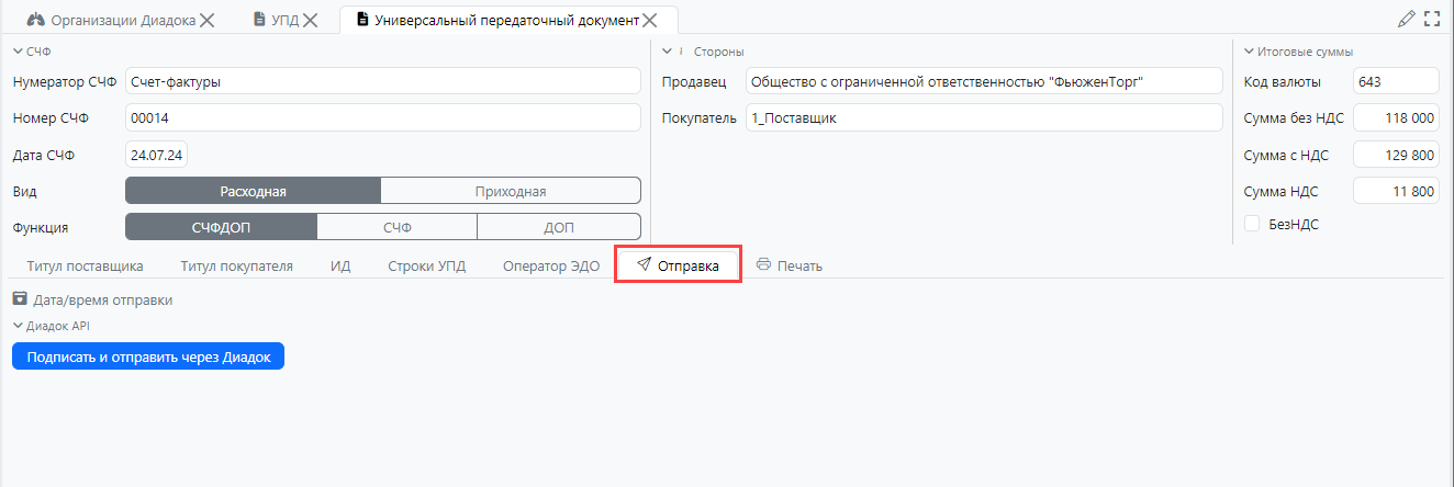 В документе УПД необходимо перейти на вкладку Отправка и нажать Подписать и отправить через Диадок.