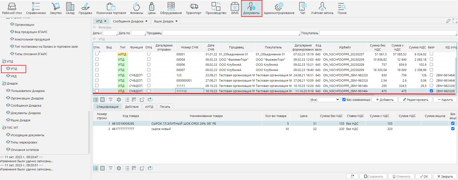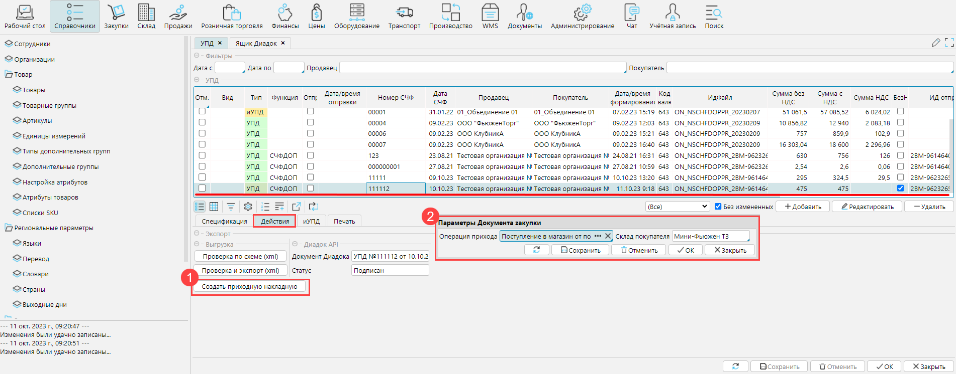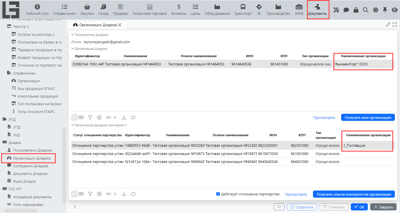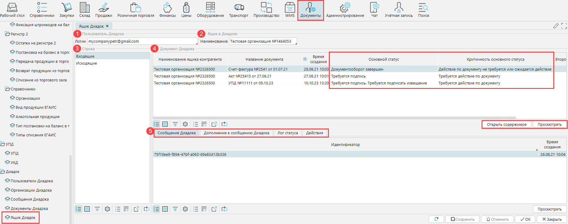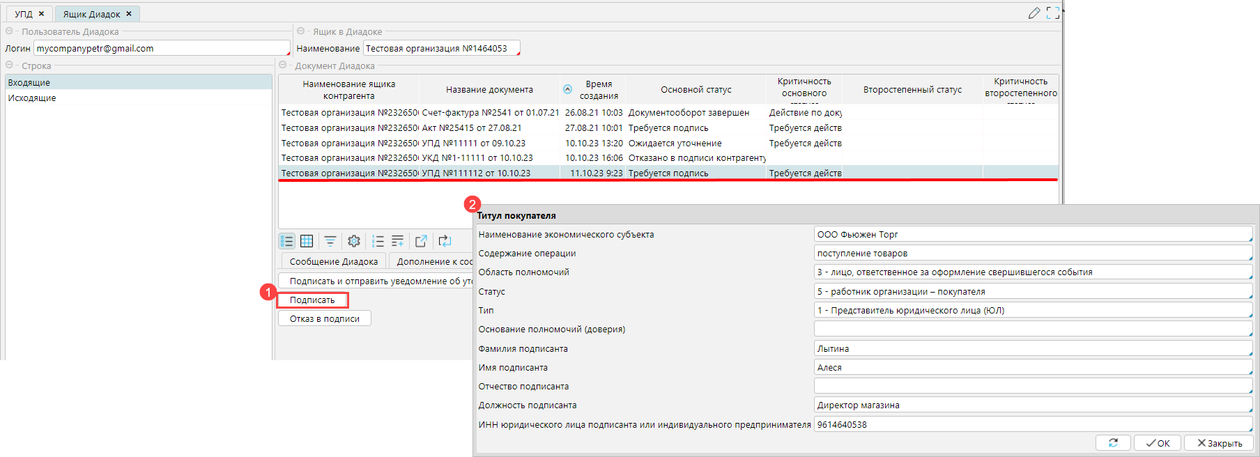 Сообщения Диадок, полученные от поставщика отображаются на форме Документы - Ящик Диадок. На форме отображается Логин пользователя Диадока (1) и Наименование компании (2), которая ведет документооборот.