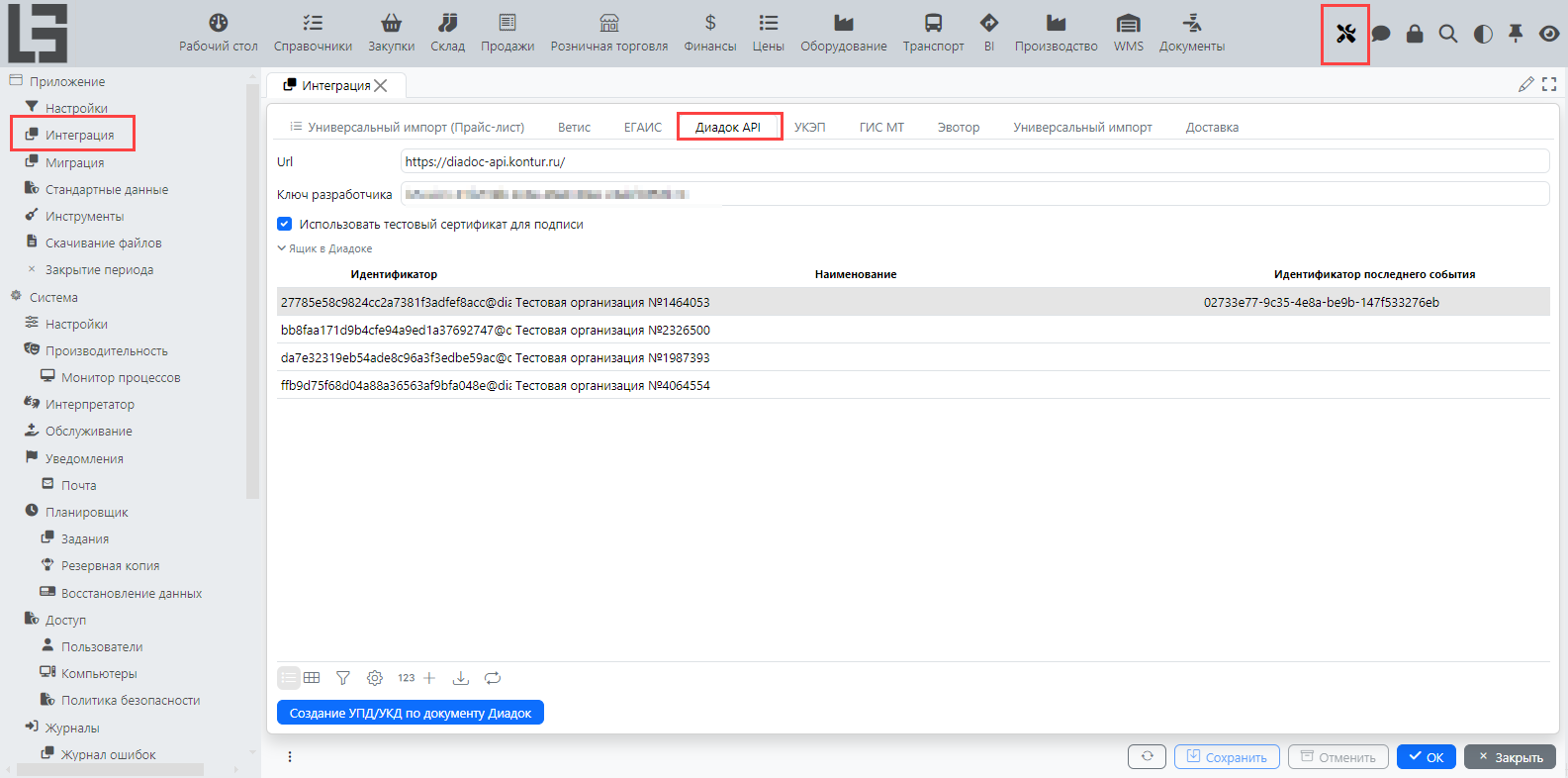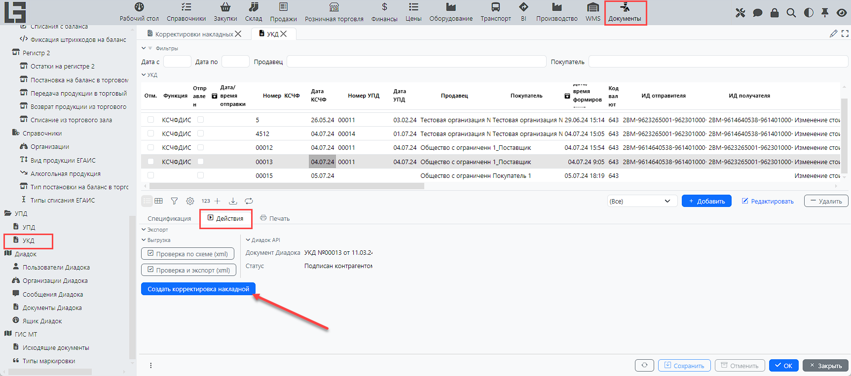- УПД и УКД можно формировать автоматически. Для этого на форме Администрирование - Интеграция - Диадок API нужно нажать кнопку Создание УПД/УКД по документам Диадок. Будут созданы документы по всем соответствующим документам Диадок для контрагентов, у которых на форме Документы - Организации Диадока заполнены соответствия организаций Диадока организациям в lsFusion ERP.