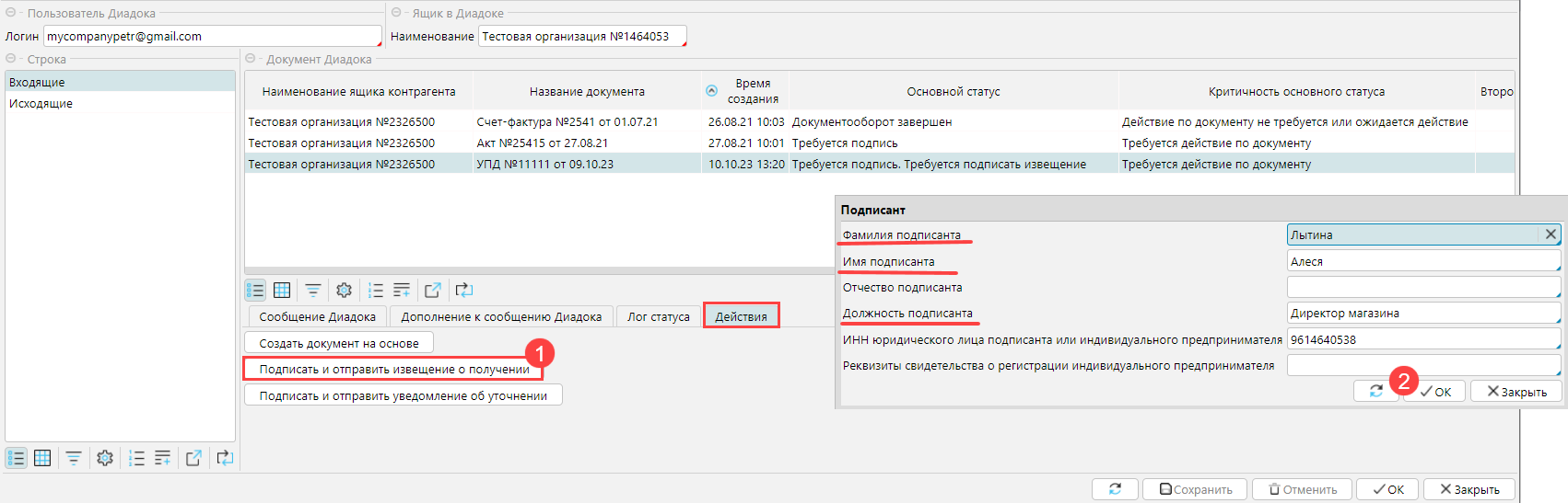 - Сначала нужно подтвердить получение нового документа. Выделить документ и на вкладке Действия нажать кнопку Подписать и отправить извещение о получении. В открывшемся окне должны быть заполнены данные подписанта. Если в карточке сотрудника, который в своей учетной записи работает с документами Диадока , заполнены ФИО и должность, форма будет заполнена автоматически.