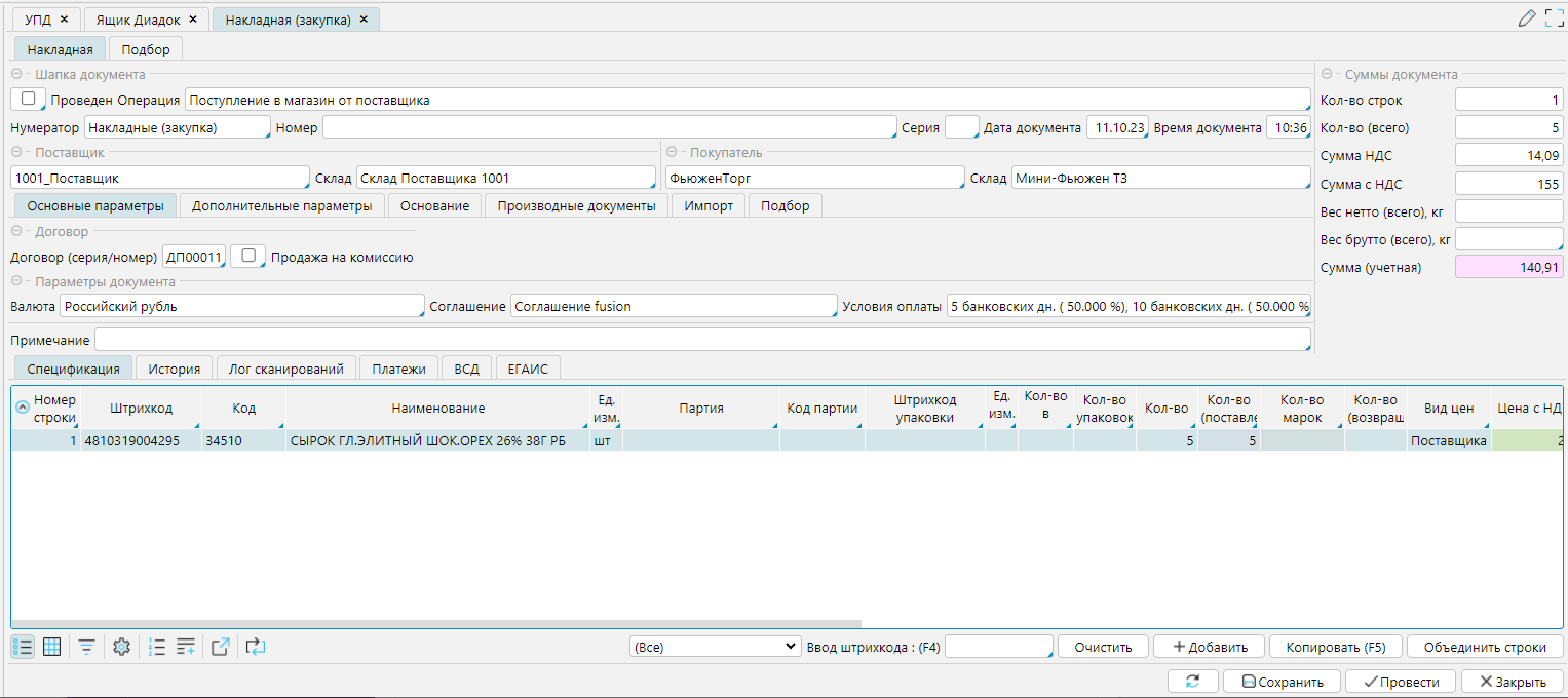 - Чтобы поставить товар на приход, из созданного по электронному документу УПД нужно сформировать приходную накладную. На форме Документы - УПД выделите сформированный по электронному документу УПД и на вкладке Действия нажмите Создать приходную накладную и в открывшемся окне укажите Операцию прихода и Склад покупателя для приходной накладной. Откроется созданная накладная. Ее нужно проверить и провести.