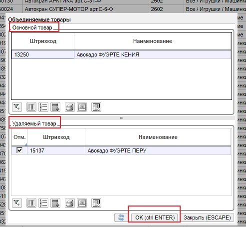 Действие работает это по принципу "заменить и удалить", т.е. в справочнике остается Основной  товар, к которому мы присоединяем (на котором курсор и нет отметки), товар, который мы присоединяем (отмеченный) удаляется. Никакие характеристики удаляемых товаров не переносятся в выбранный единственно нужный. В том числе штрихкоды.