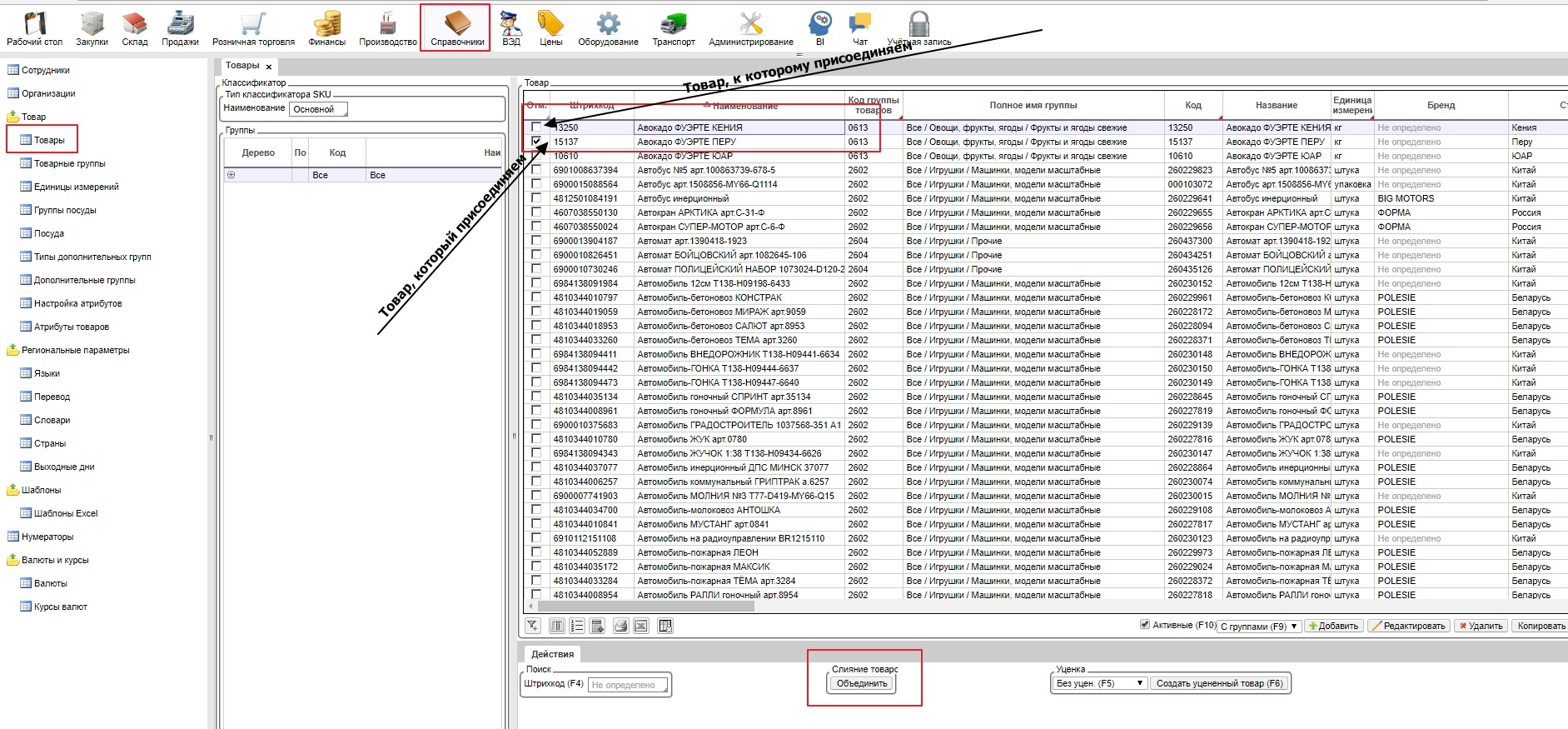 Находясь в справочнике товаров, необходимо отметить галочкой тот товар(ы), который необходимо присоединить.