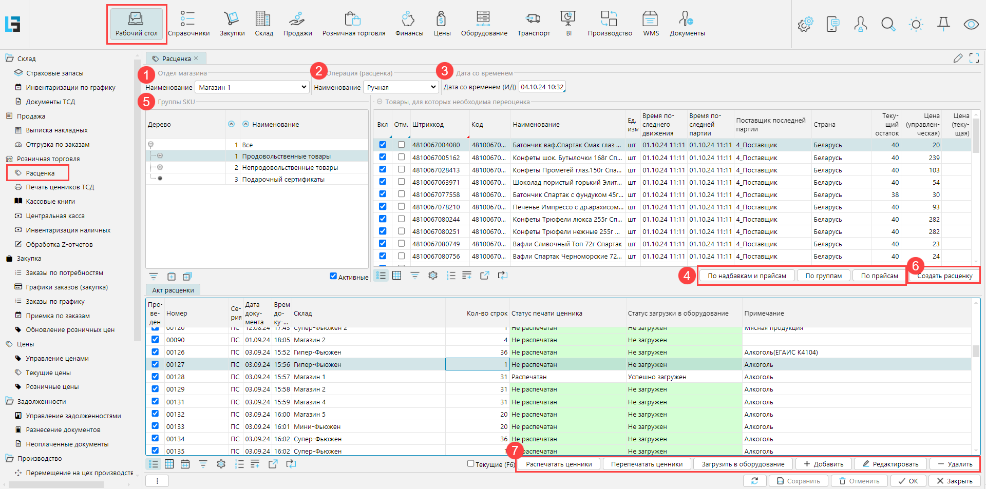 1. Отдел магазина Наименование - выбрать отдел магазина, на котором производится расценка