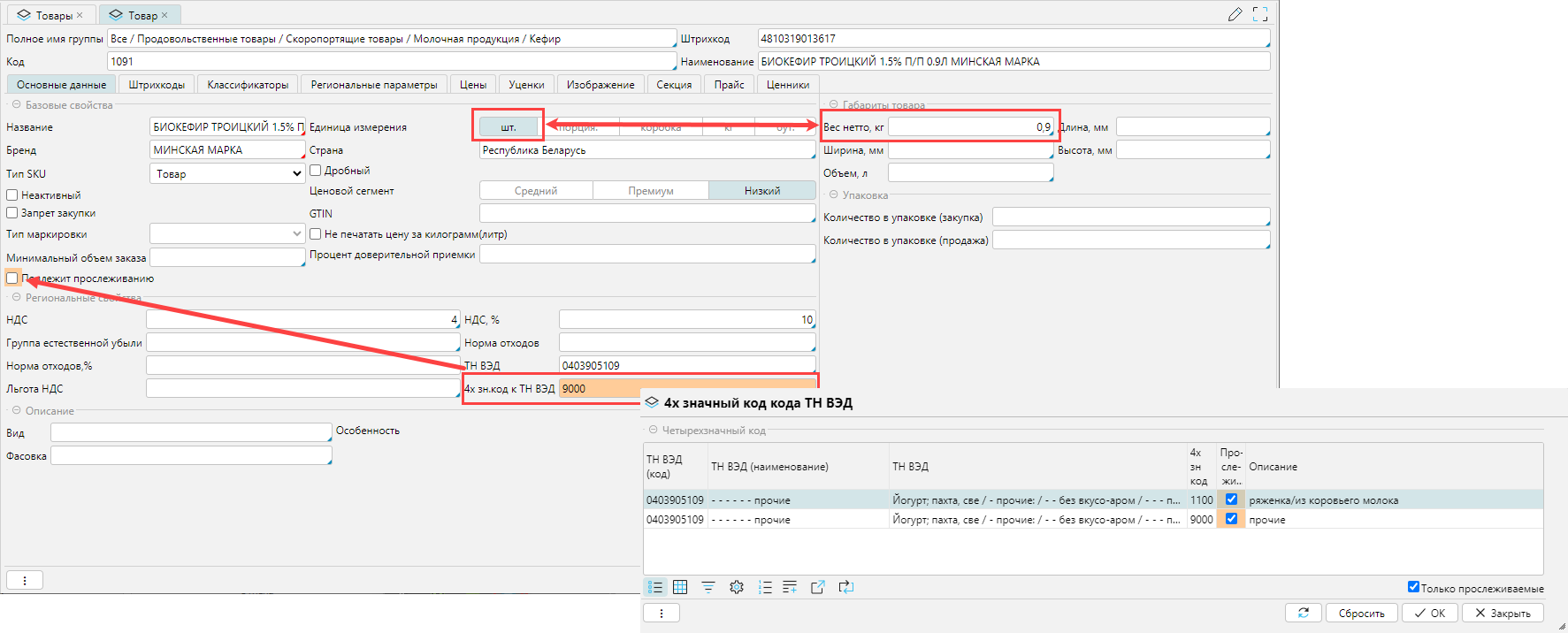 Обратите внимание! Если единица измерения товара не соответствует единице прослеживаемости по Постановлению Совета Министров РБ №537 от 25.07.2024, то в блоке Габариты товара нужно указать соответствующие значения для пересчета. Например, если кефир учитывается в штуках или бутылках, то должен быть заполнен вес нетто 1 штуки в кг.