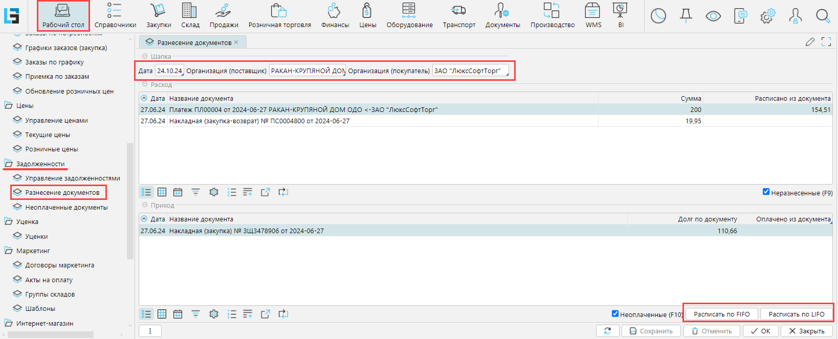 На форме Рабочий стол - Разнесение документов в секции Расход отображаются документы, уменьшающие задолженность, в основном платежи. В секции Приход отображены документы, увеличивающие задолженность, по которым можно распределить выделенный платеж.