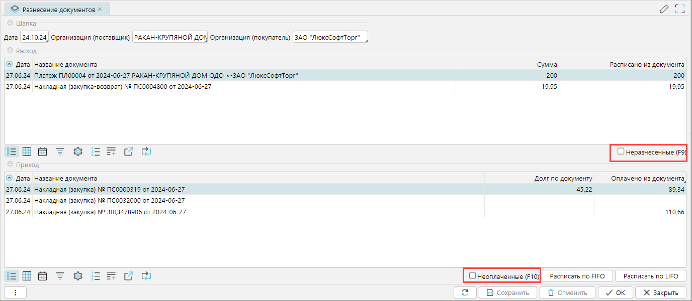 По умолчанию на форме включен фильтр Неразнесенные для документов расхода, и отображаются документы, суммы по которым либо не разнесены по документам прихода, либо разнесены только частично.