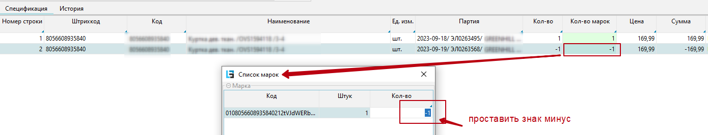3) нажать на цифру в колонке "Кол-во марок" в строке где товар указан в отрицательном количестве, и так же для марки в колонке "Кол-во" указать знак минус и нажать OK в окне Список марок