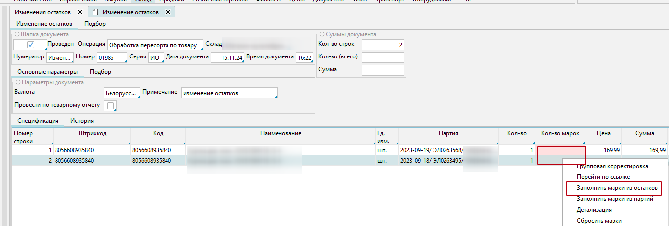 1) в документе где уже товар указан с обеими партиями - стать на колонку "Кол-во марок" , нажать правой клавишей мыши и в выпавшем меню выбрать пункт - "Заполнить марки из остатков". После этого марка будет указана в обеих строках товара.