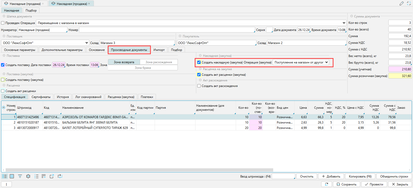 При перемещении товара по электронной накладной между собственными складами и магазинами может использоваться механизм производных документов.
