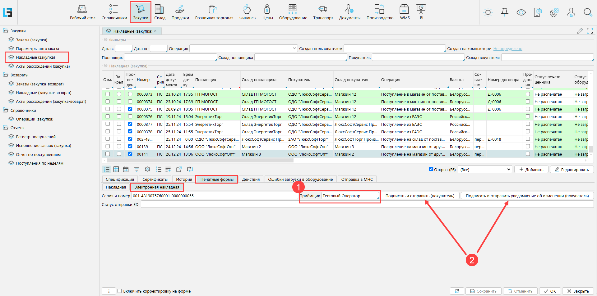 После заполнения атрибутов электронной накладной и ее отправки, склад-получатель на форме Закупки - Накладные находит накладную, на вкладке Печатные формы - Электронные накладные заполняет Приемщика и отправляет ответ: подтверждает накладную или отправляет уведомление об изменении.