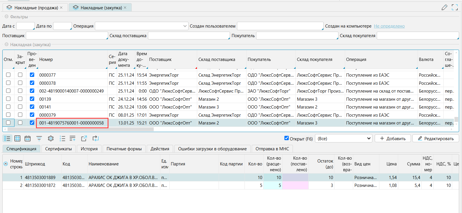 Таким же будет и номер порожденной накладной-закупки: