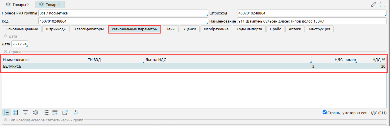 Ставка НДС, с которой работает ваша собственная компания, указывается в карточке товара на вкладке Региональные свойства. Эта ставка, указанная в карточке товара, автоматически используется (подтягивается) в строки спецификации (в момент добавления товара) расходных документов, расценки и переоценки (в графы НДС после).