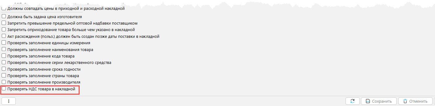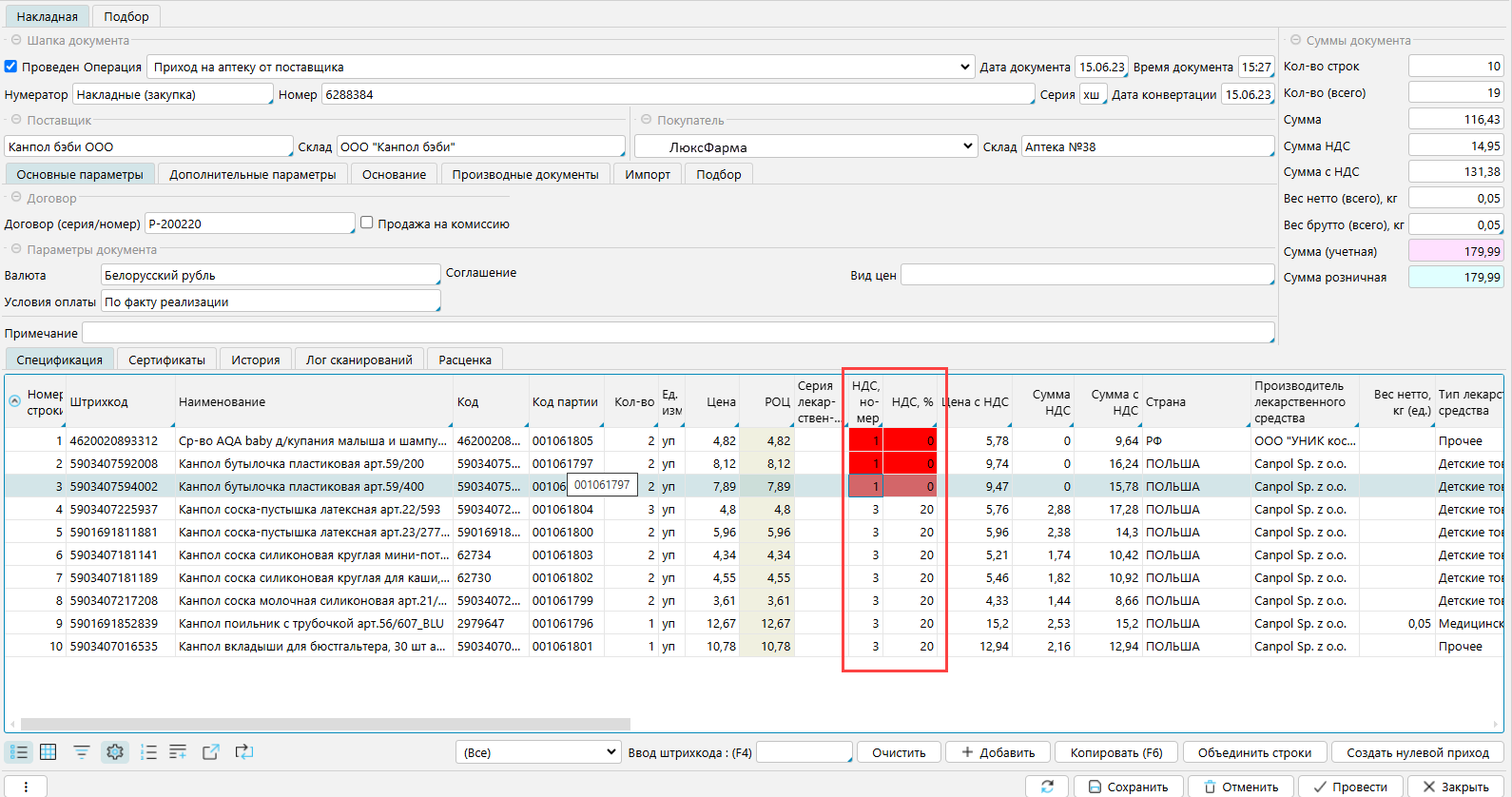 По умолчанию в накладную подтягивается НДС, указанный в карточке товара. Если поставщик работает с другим НДС, то его нужно изменить вручную (если накладные импортируются, то соответствующим образом настраивается импорт). Когда НДС в спецификации приходного документа (НДС поставщика) не совпадает с НДС в карточке товара (ваш НДС), то поле НДС подсвечивается красным (рис. 5). Подсветка информационная и никаких ограничений на документ не накладывает. Если есть необходимость, можно запретить проведение накладных, в которых НДС не соответствует НДС из карточки товара. Для этого в настройке операции закупки на вкладке Ограничения нужно отметить признак Проверять НДС товара в накладной.