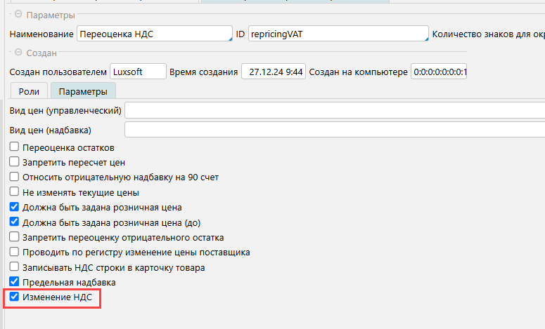 Для переоценки НДС необходимо создать операцию переоценки, в которой должен быть отмечен признак Изменение НДС.