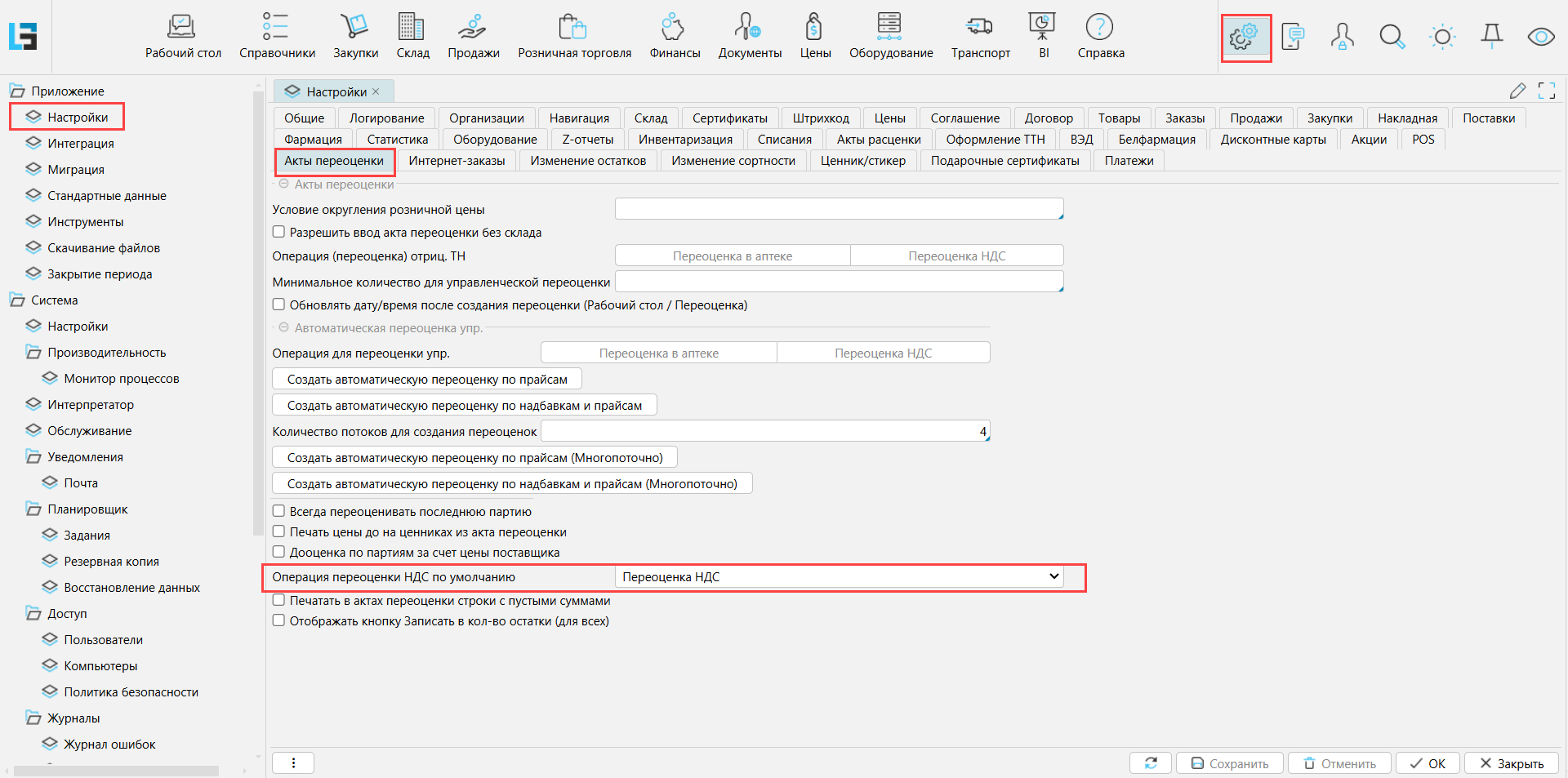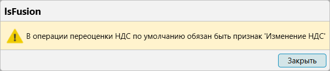 На форме Администрирование - Настройки - Акты переоценки нужно указать Операцию переоценки НДС по умолчанию и сохранить изменения. Если будет выбрана операция без признака изменения НДС, программа не позволит сохранить изменения и выдаст предупреждение .