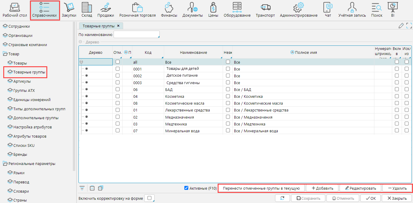 На Форме СправочникиТоварные группы отображаются товарные группы основного классификатора. Товарные группы имеют иерархическую структуру. Управление товарными группами осуществляется с помощью кнопок ДобавитьРедактироватьУдалить в правом нижнем углу формы. Кнопка Перенести отмеченные группы в текущую позволяет быстро изменить порядок иерархии товарных групп.