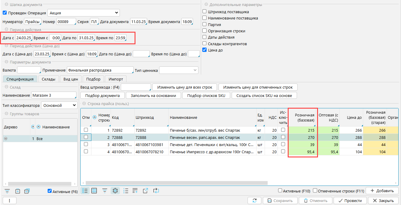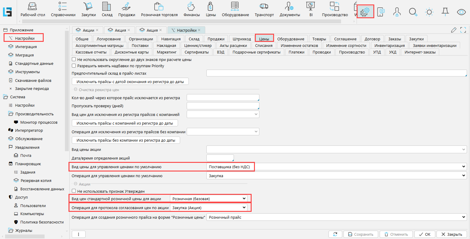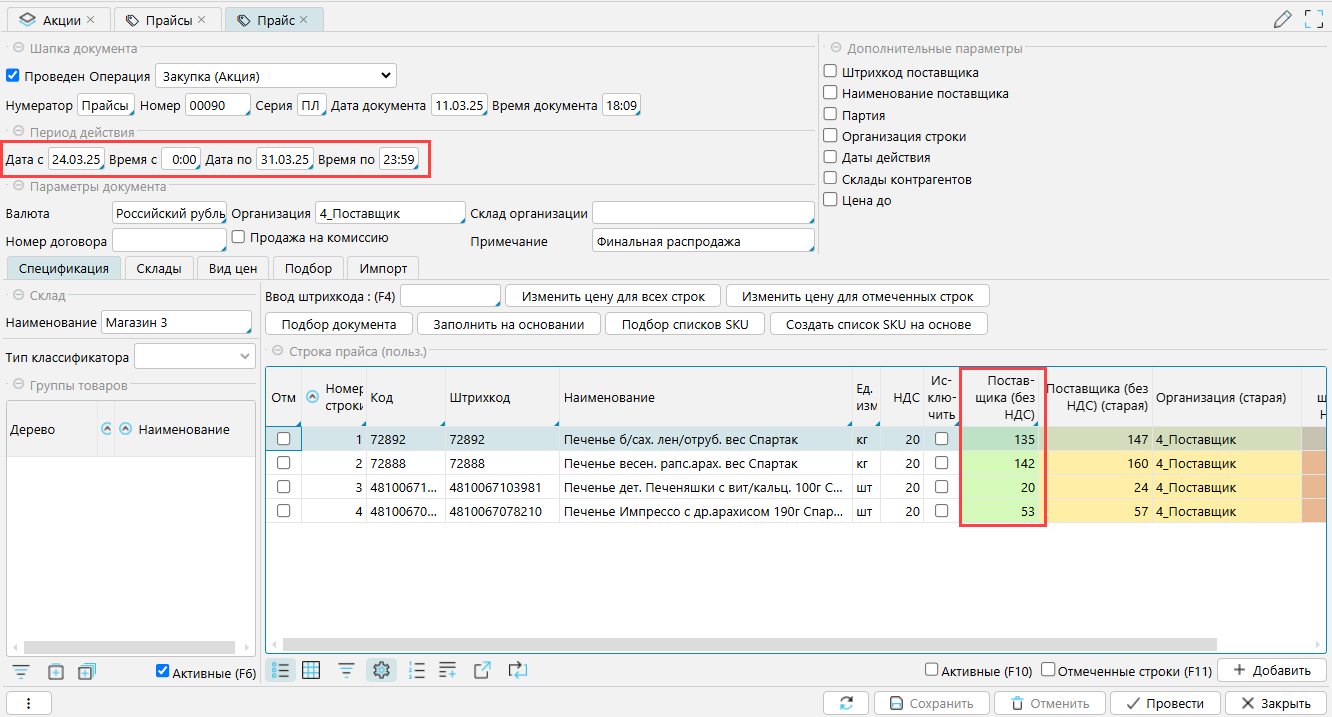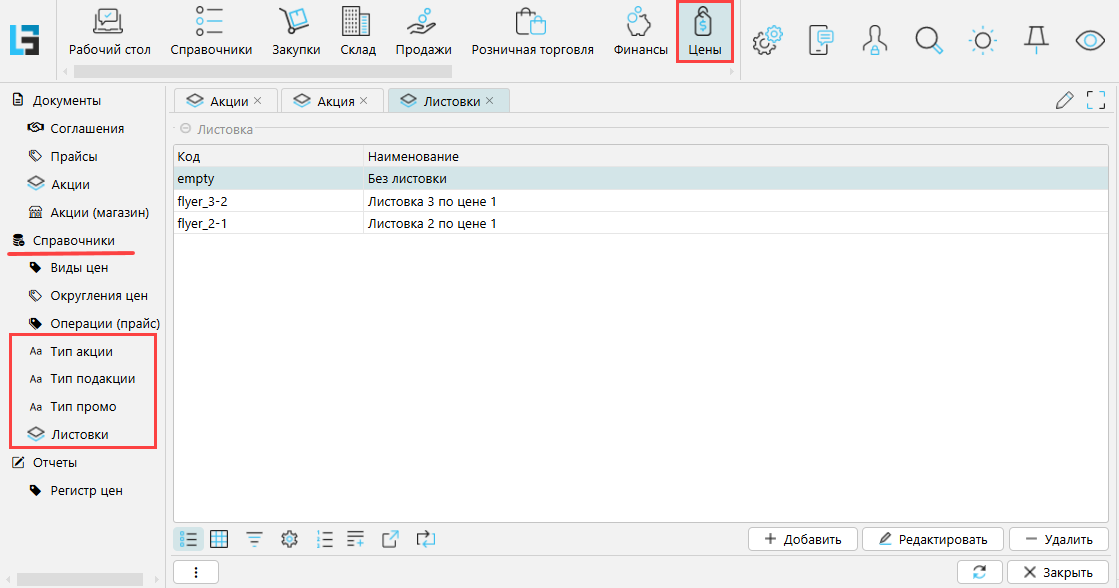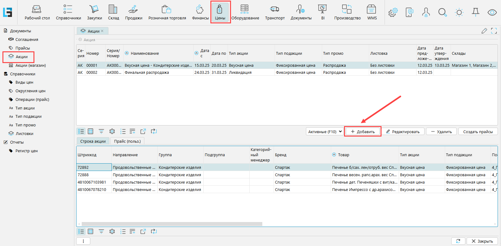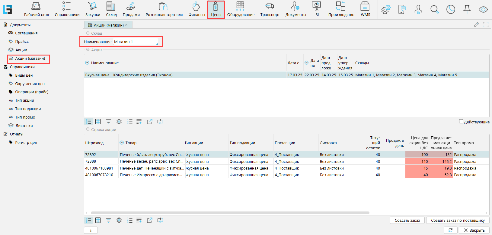 Прошедшие и планирующиеся акции отображены на форме Цены-Акции.