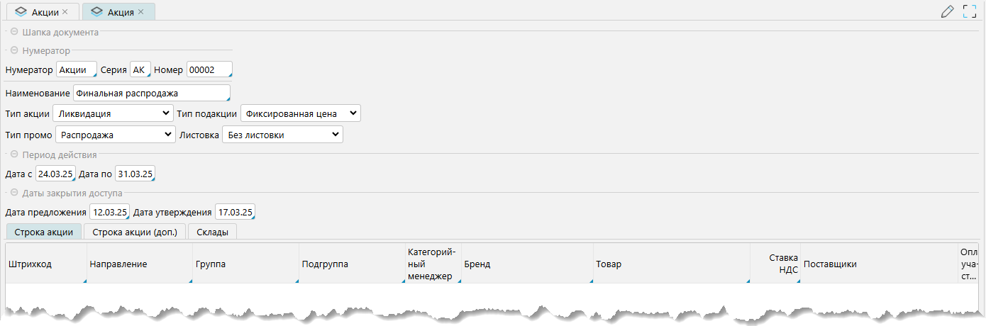 В открывшейся форме документа Акция необходимо заполнить данные по планируемой акции.
