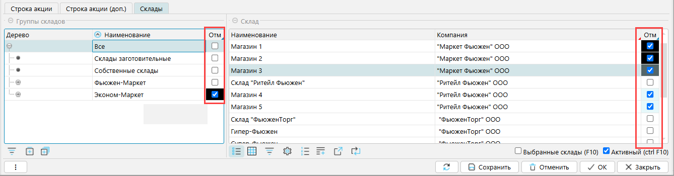 Необходимо выбрать склады или группы складов, где будет действовать акция. Для этого поставьте признак Отм. для каждого объекта. Если отмечена группа складов, то все склады группы будут включены в выборку. Чтобы выбрать отдельный склад, нужно отметить объекты в блоке Склад.