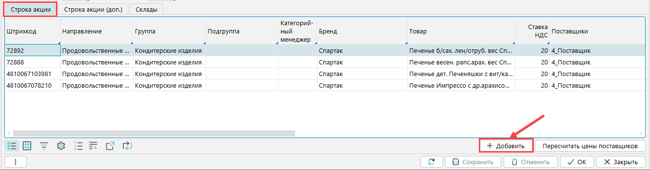 На вкладке Строка акции создается список товаров, которые участвуют в акции и формируется акционная цена. Чтобы включить товар в акцию, нужно кнопкой Добавить создать новую строку и выбрать товар из справочника.