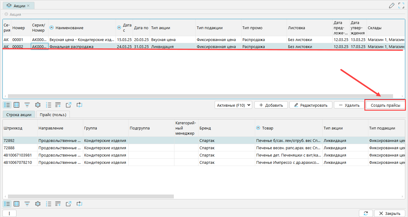 После того, как акция запланирована, в нее добавлены все товары и определены цены, можно создать прайсы. На форме Цены-Акции нужно выделить акцию и нажать Создать прайсы.