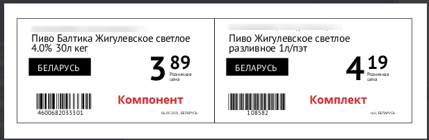 При печати ценника с приходной накладной компонента (используя кнопку "Распечатать ценники"), печатается ценник на все комплекты, в которых участвует товар-компонент.