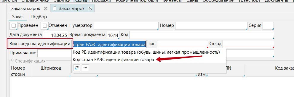 Заказ марок российского образца (Код стран ЕАЭС идентификации товара, используется в системе "Честный знак" РФ) в целом происходит по общему алгоритму, однако на форме заказа марок (Склад - Марки - Заказы марок Добавить/Редактировать заказ) необходимо в поле Вид средства идентификации выбрать Код стран ЕАЭС идентификации товара далее заполнять по общему алгоритму.