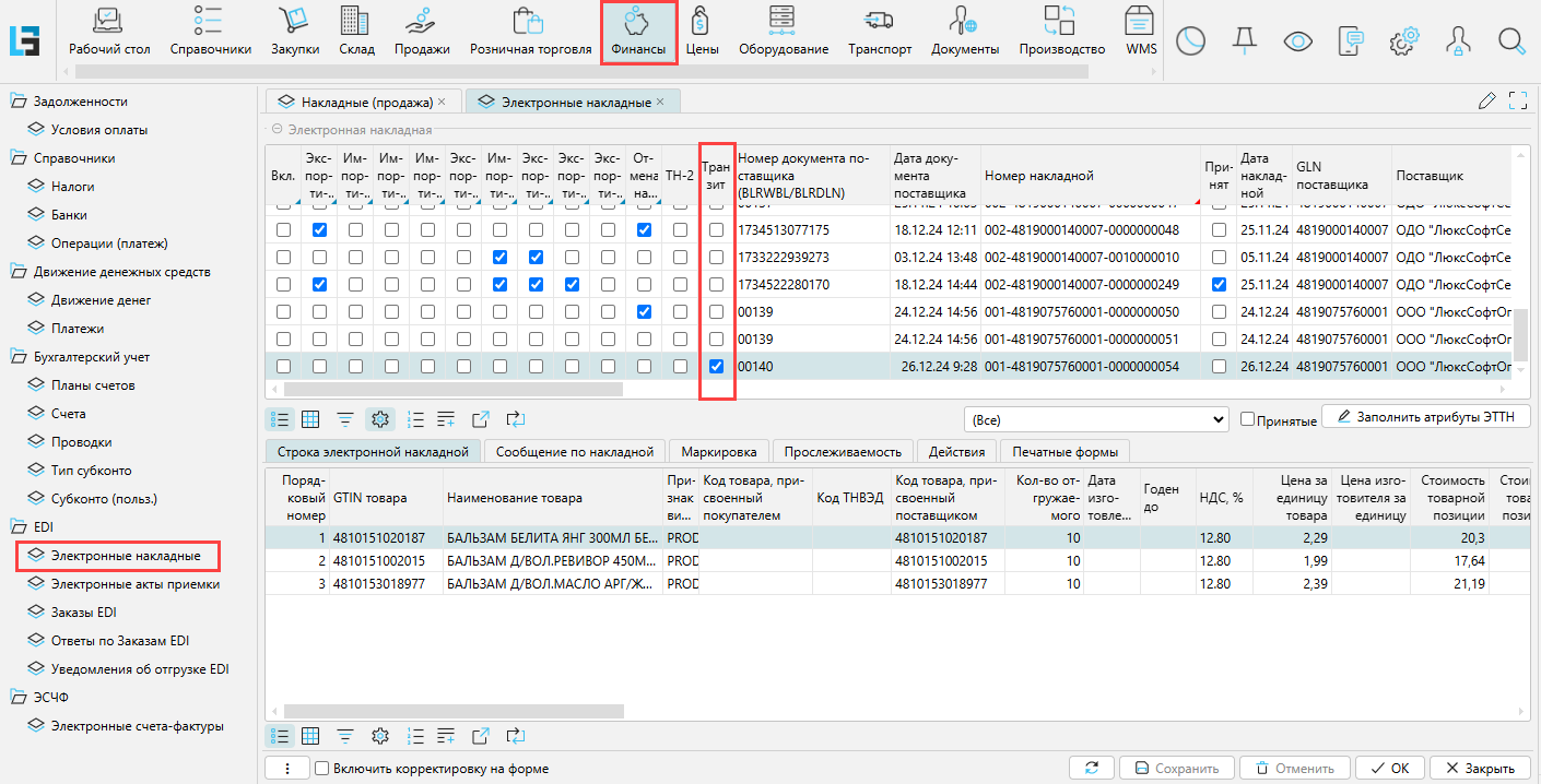 Будет создана электронная накладная с признаком трансграничного  обмена.  Она будет отображаться на форме Финансы - Электронные накладные с признаком Транзит.