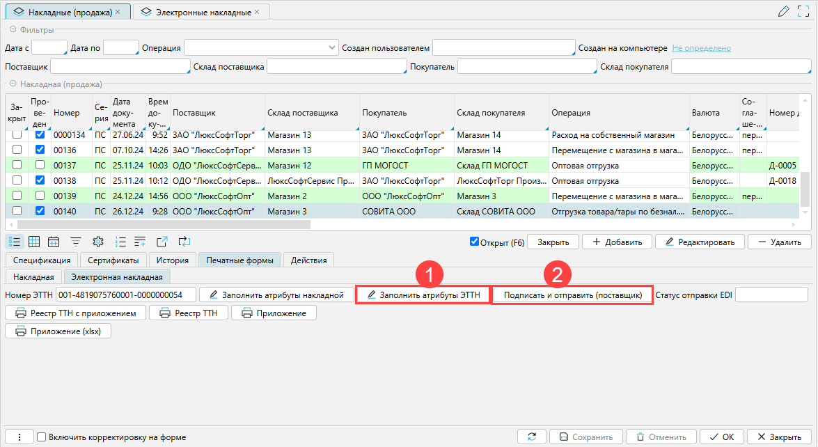 Чтобы отправить накладную, необходимо Заполнить атрибуты электронной накладной и нажать Подписать и отправить (поставщик)