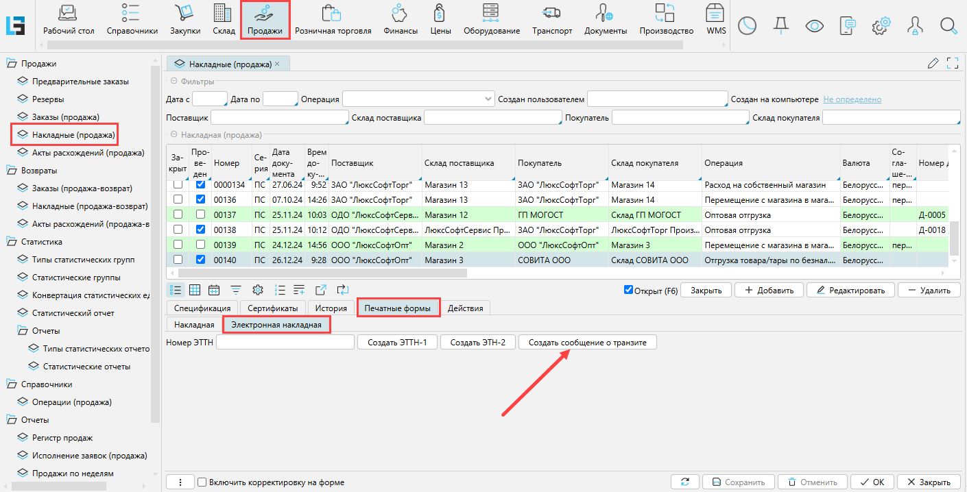 Если товар подлежит прослеживанию, то для отправки товара  российскому контрагенту по электронной накладной, необходимо создать расходную накладную, как обычно, затем перейти на форме Продажи - Накладные на вкладку Печатные формы - Электронные накладные и нажать Создать сообщение о транзите.