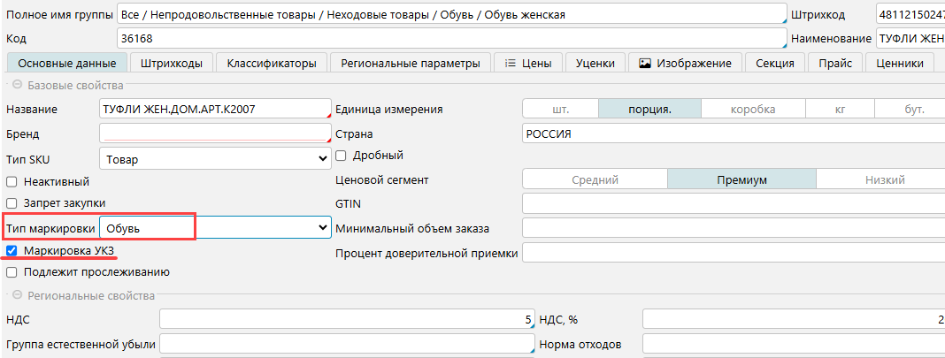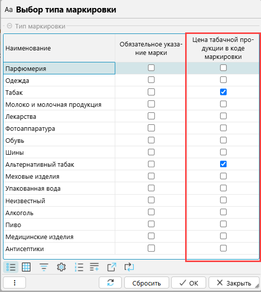 Также этот признак может быть установлен на уровне типа маркировки. В этом случае его наследуют все товары, которым назначен тип маркировки. Установить признак на уровне типа маркировки может только разработчик. Просмотреть, назначен ли признак на уровне типа маркировки
