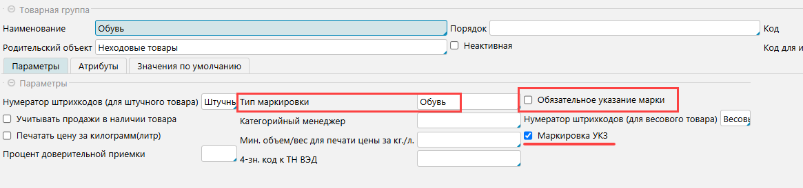 Обязательное указание марки - если отмечен признак и для товара из этой группы не будет указана марка в операциях, то система не позволит провести такую операцию.