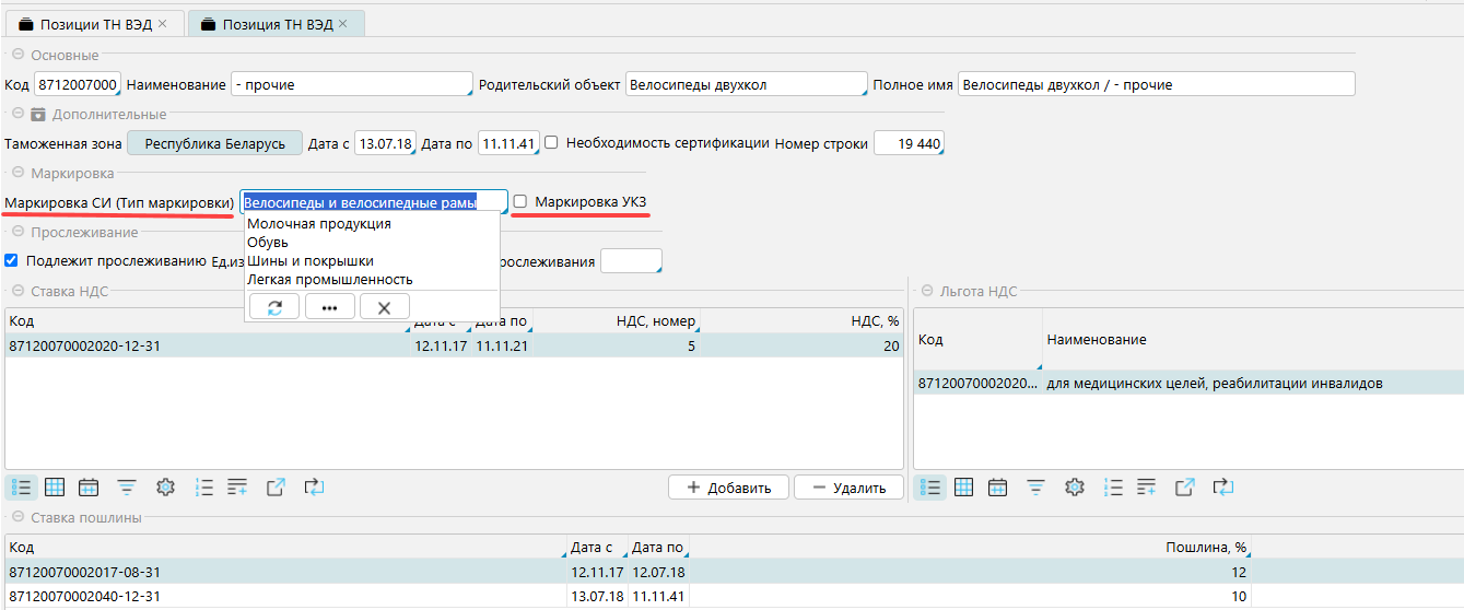 Также в белорусской логике признак Типа маркировки и Маркировки УКЗ можно установить на уровне кода ТН ВЭД, и он будет наследоваться товарам с этим кодом.