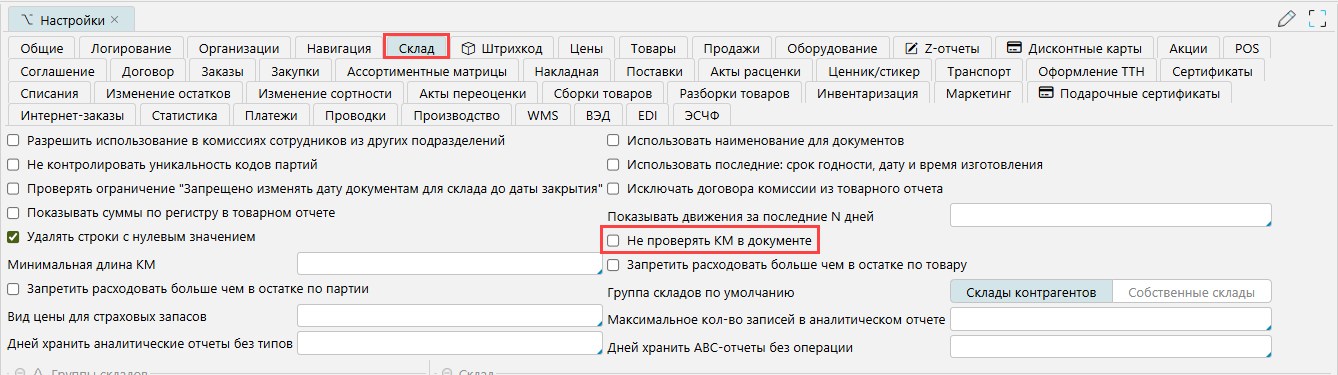 Если на уровне типа маркировки установлен признак Обязательное указание марки, но его нужно отключить, то это можно сделать без привлечения разработчика: на форме Администрирование - Приложение - Настройки на вкладке Склад отметить признак Не проверять КМ в документе, и система будет проводить документы без указания марок.