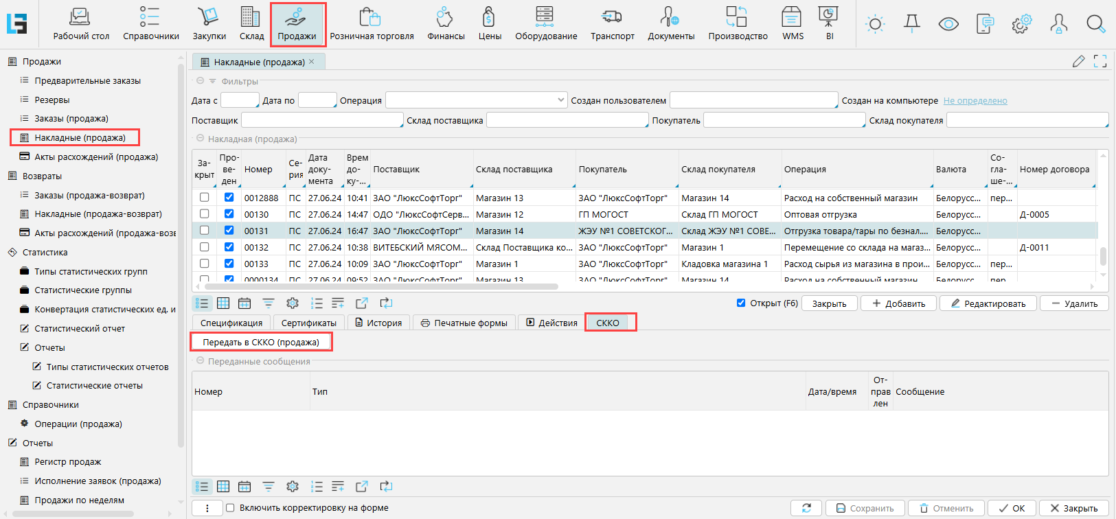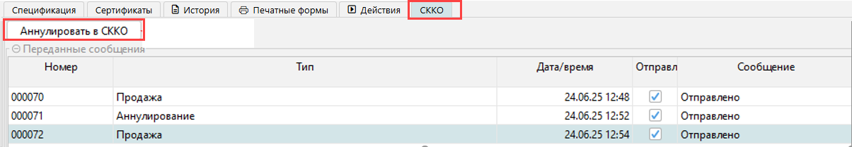 В таблице ниже будут отображены все переданные в СККО сообщения. Переданные данные о продаже можно аннулировать. Когда данные по накладной продажи отправлены, появляется кнопка Аннулировать в СККО.