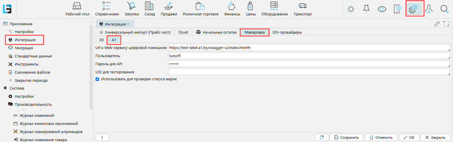 Для проверки статуса марки в приходных документах интеграция настраивается на форме Администрирование - Приложение - Интеграция на вкладке Маркировка - А1: