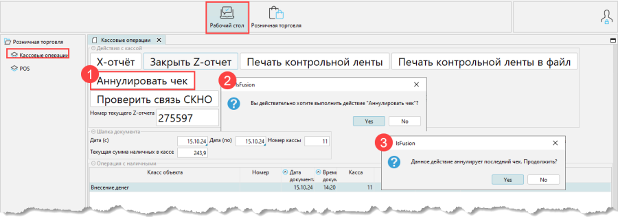 Аннулировать можно только последний пробитый чек. Для этого нужно перейти на форму Рабочий стол - Кассовые операции и нажать кнопку Аннулировать чек, затем согласиться продолжить действие.