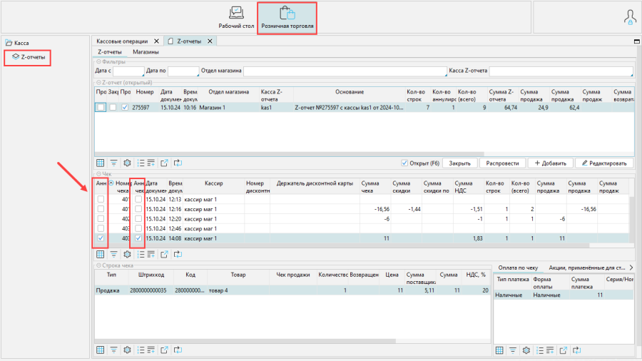 Аннулированный чек виден в Z-отчете на одноименной форме Розничная торговля - Касса - Z-отчеты.
