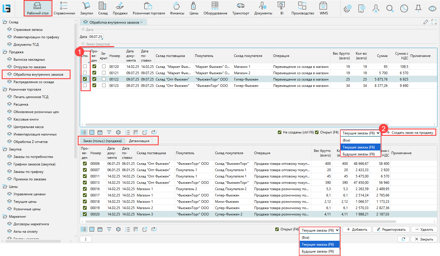 В верхнем блоке Заказ (закупка) отображаются все текущие заказы на закупку от собственных складов и магазинов. Изменив фильтр можно просмотреть Будущие заказы или Все, В нижней части на вкладке Заказ (польз.)(продажа) по умолчанию отображаются все открытые текущие заказы на продажу. С помощью фильтра можно просмотреть Будущие заказы или Все. На вкладке Детализация отображаются товарные строки выделенного в верхней части заказа на закупку.