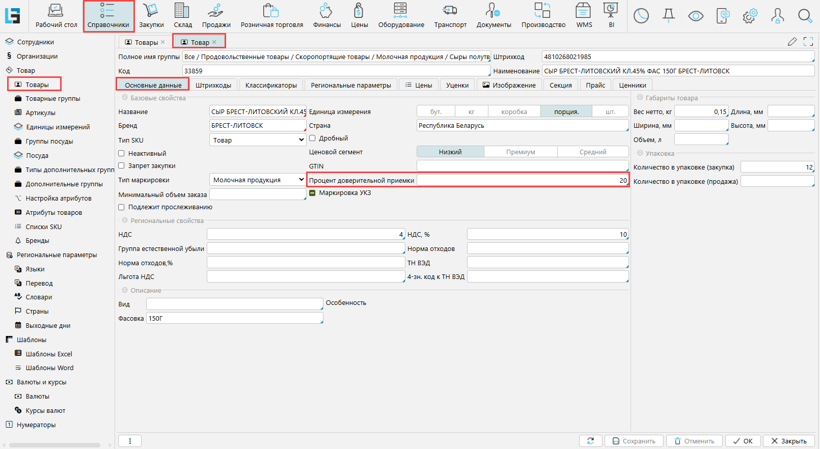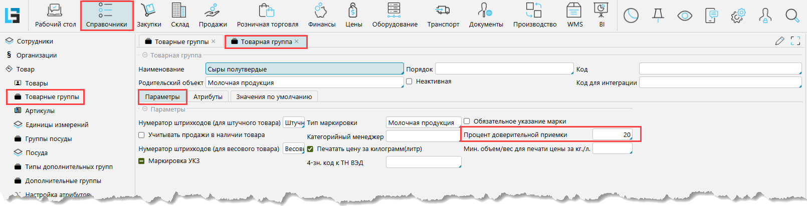 • на уровне товарной группы на форме Справочники - Товар - Товарные группы откройте карточку товарной группы и на вкладке Параметры в поле Процент доверительной приемки установите значение в процентах, которое будет действовать на все товары в этой группе;