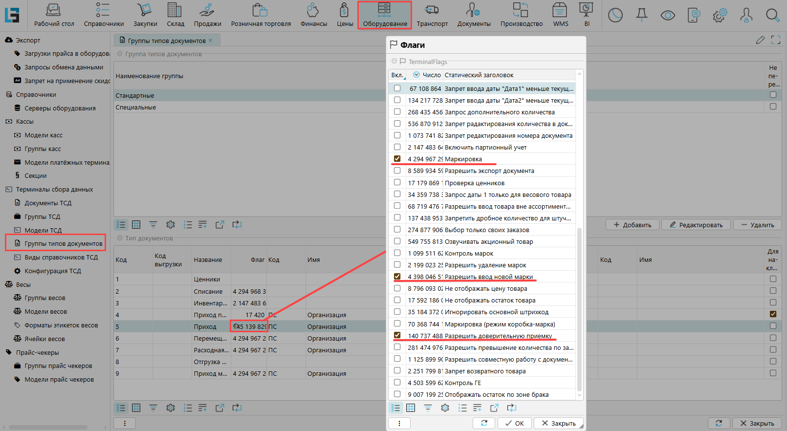 Для типа документа ТСД, по которому будет проводиться доверительная приемка, на форме Оборудование - Терминалы сбора данных - Группы типов документов нужно выделить документ, вызвать контекстное меню , нажать команду Показать расшифровку и отметить флаги: Маркировка, Разрешить ввод новой марки Разрешить доверительную приемку