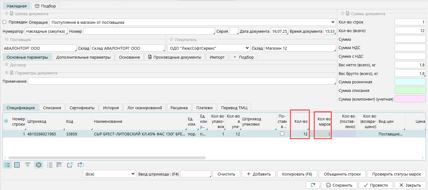 Необходимое для сканирования количество марок рассчитывается следующим образом: для указанного по товару количества система высчитывает установленный процент доверительной приемки и округляет вверх до целого числа. В примере на рис. 4 установлен процент доверительной приемки 20%, количество по строке товара - 12шт.  Количество марок, которые нужно отсканировать получается 3 (12*20%=2,4 +округление вверх = 3).