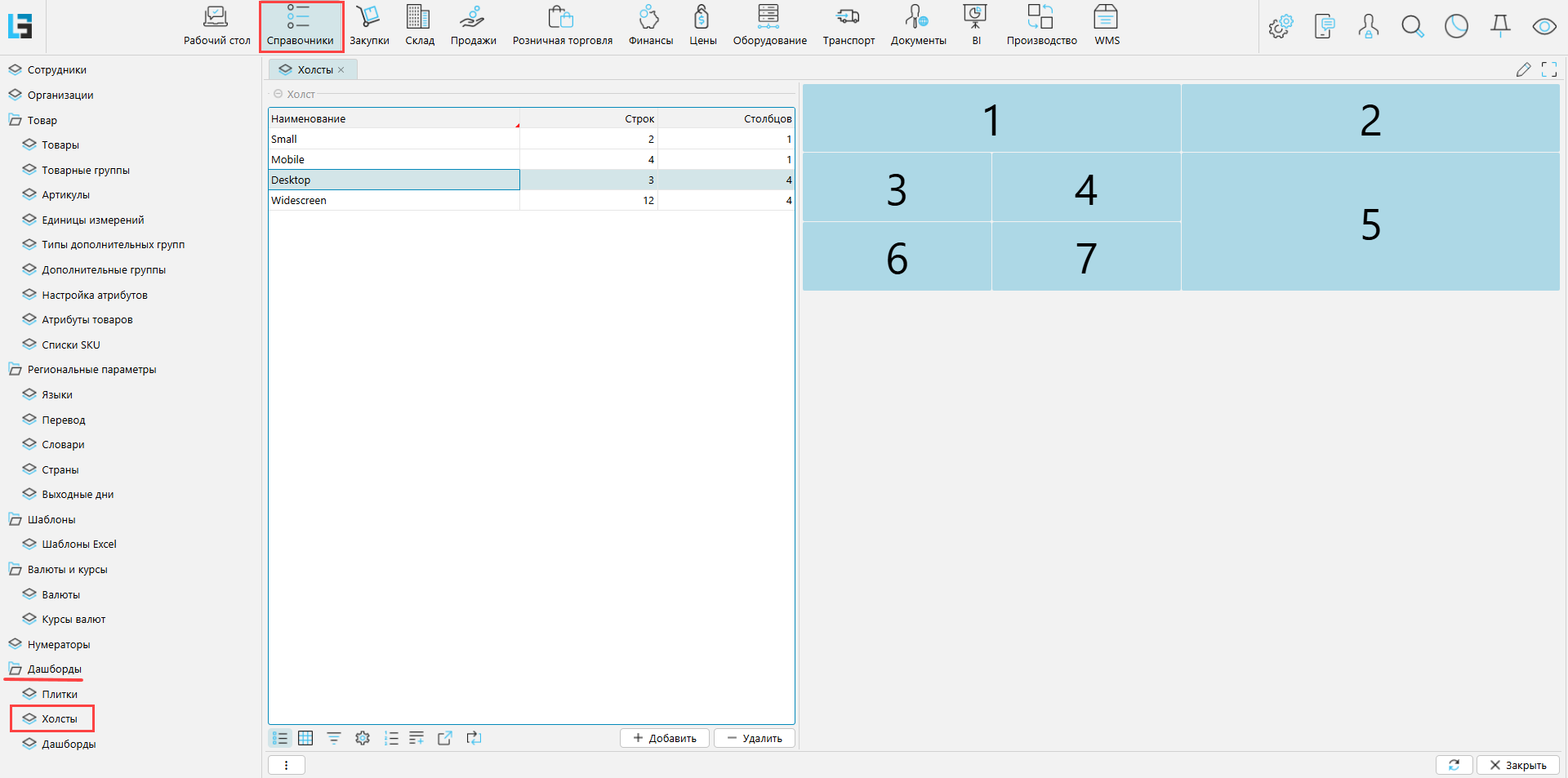 На форме Справочники - Дашборды - Холсты отображается список настроенных в системе холстов, можно настроить новые и удалить неиспользуемые. Превью выделенного в левой части холста отображается в правой части формы.