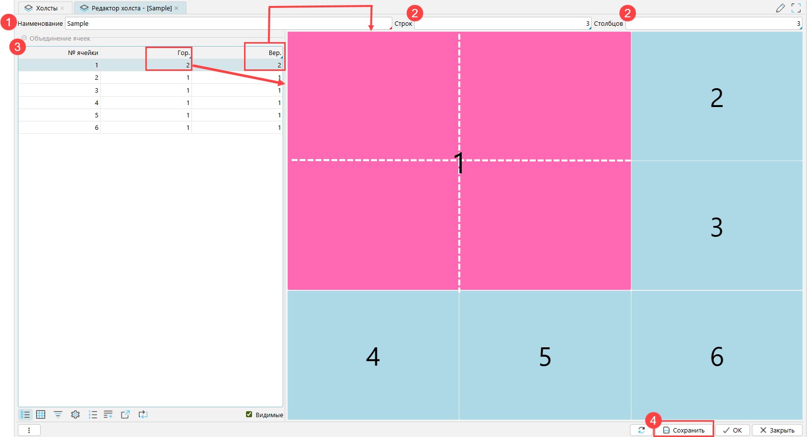 Чтобы настроить новый холст, необходимо создать новый холст кнопкой Добавить и  в открывшемся редакторе холста настроить его параметры.