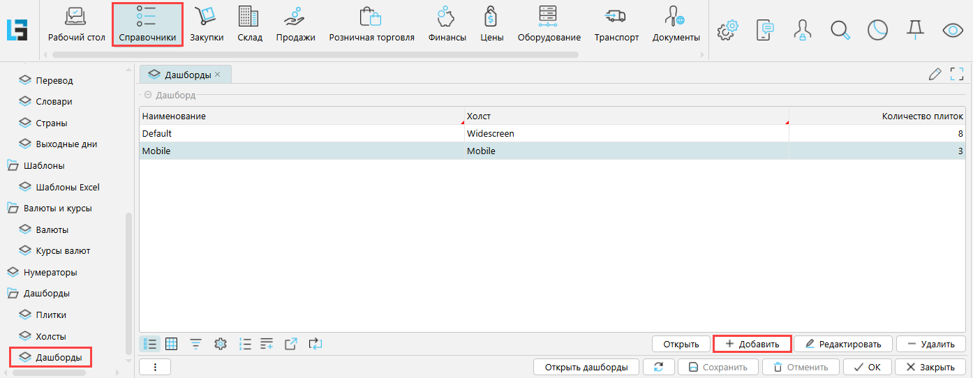 Все дашборды, которые созданы в системе отображаются на форме Справочники - Дашборды - Дашборды. Для управления дашбордами используют кнопки: